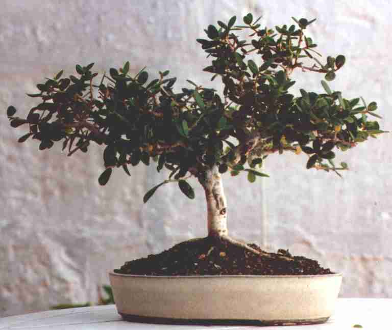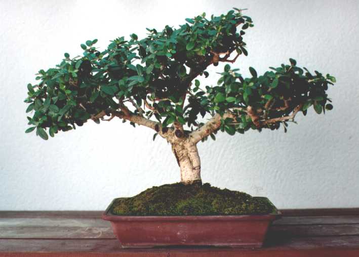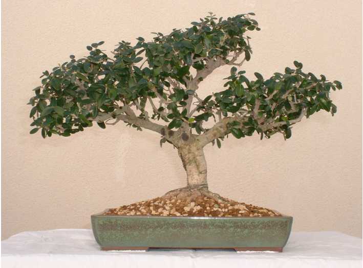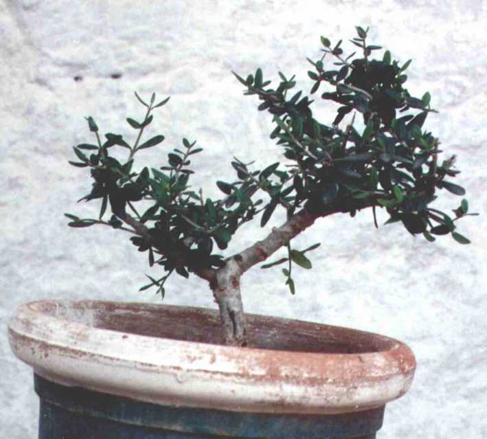 Agosto 2005 Árbol perennifolio de hojas verde brillante y a diferencia del olivo menos alargadas que este y con el envés verde claro. Son árboles muy longevos posiblemente sean los seres vivos más viejos del archipiélago balear. Muy adecuado para bonsai por su resistencia y rápido crecimiento tras la poda, soporta podas drásticas y se recupera fácilmente de los transplantes. El pinzado constante hará que reduzca considerablemente el tamaño de la hoja, aunque de por si ya es bastante menor que la del olivo. Este año ha sido transplantado a una maceta más acorde con el nuevo modelado. Este árbol había sido descuidado, por lo que se ha llegado al momento de replantearse su diseño, se podaron algunas ramas y acortado el resto.