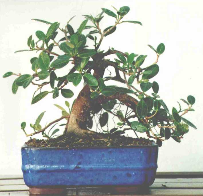 Junio 1996 Con la nueva posición de plantado se deja al descubierto el nebari. Tres años de cultivo y no se ha conseguido gran cosa, tiene una fuerte tendencia apical, (como todos los ficus) se pinza el nuevo brote del extremo y vuelve a brotar del mismo sitio, no se consigue que brote de más atrás. El desarrollo se hace excesivamente lento, pero no se desiste.