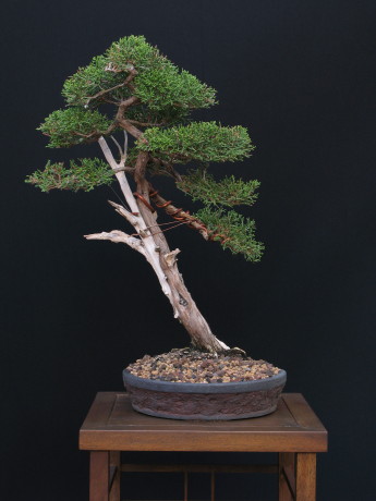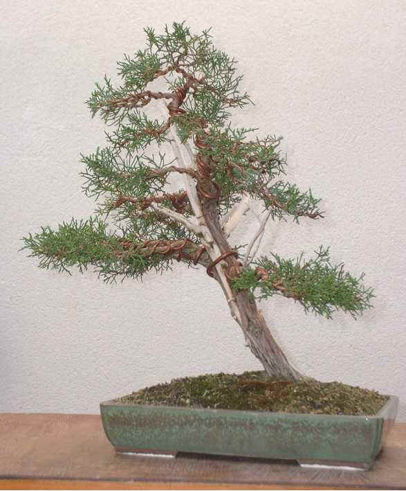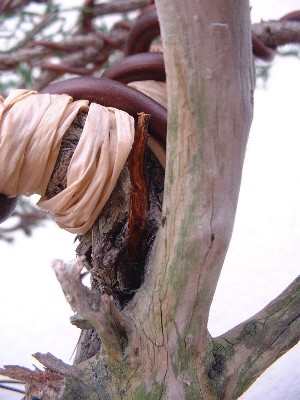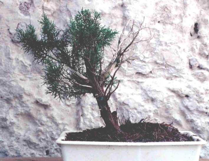 Preparada para ser trasplantada a un nuevo tiesto más adecuado, de gres sin esmaltar. Fue alambrada por completo un par de meses antes. Necesita pinzado pero se esperará a ser trasplantada y se recupere. No es conveniente realizar más de una operación al mismo tiempo en las sabinas, de hacerlo responden con brotación en aguja o se debilitan. |