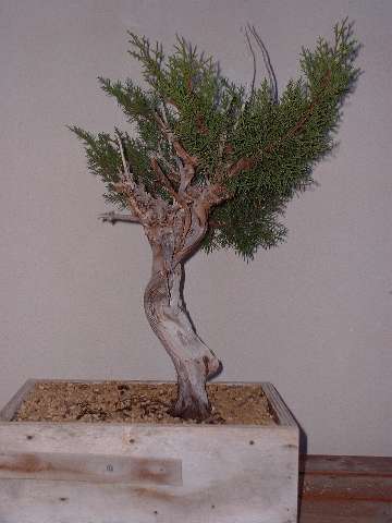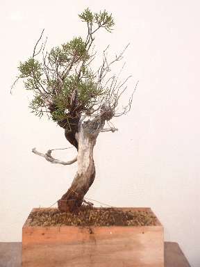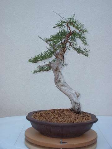 Abril 2006 Este es el resultado de la remodelación efectuada en un taller con Gabriel Romero. El diseño del año anterior no me convencía y aproveché la ocasión para trabajarla de nuevo. Se usó como frente la parte posterior inicial, dando un cambio drástico al conjunto. Ahora sí que estoy satisfecho de esta sabina, con el tiempo se transplantará a una maceta más pequeña, pero para ello habrá que trabajar las raíces en los dos próximos transplantes para que quepa. |