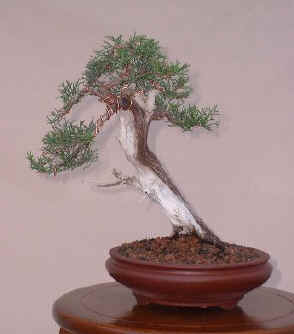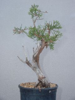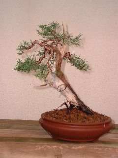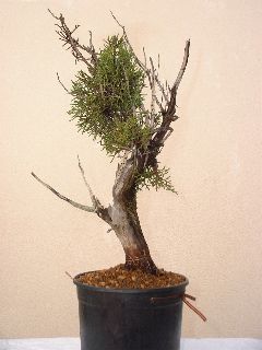 Abril 2004. Durante este año pasado el crecimiento fue favorable por lo que estaba a punto para ser trabajada. Se ha transplantado a una maceta tokoname, acortado el follaje y alambrado básico para empezar a definir el futuro diseño. |