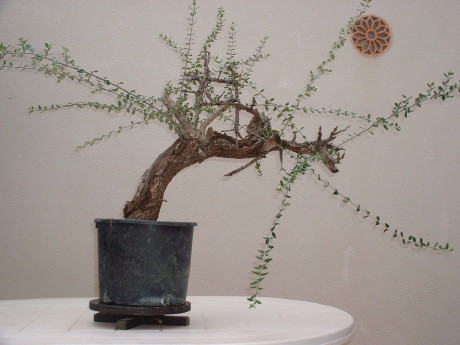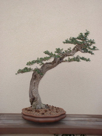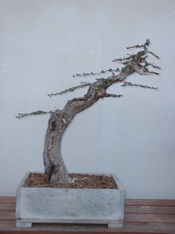 Este es el aspecto tras su enraizado en junio del 2003, sin ninguna duda va a ser un árbol muy interesante. Este acebuche vivía de la única forma que podía hacerlo: arrastrado por el suelo, dadas las duras condiciones, terreno pobre y castigado por el fuerte viento de tramontana. |